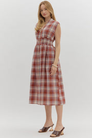 Plaid pattern V-neck sleeveless midi dress featuring