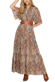 Half flutter sleeve woven print tiered maxi dress with full lining. Does not include belt.