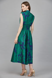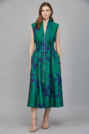 Bold floral pattern jacquard fabric frontzip closure v-neckline midi dress.100% PolyesterSize Guide: Small 4/6. Medium 6/8. Large 10/12